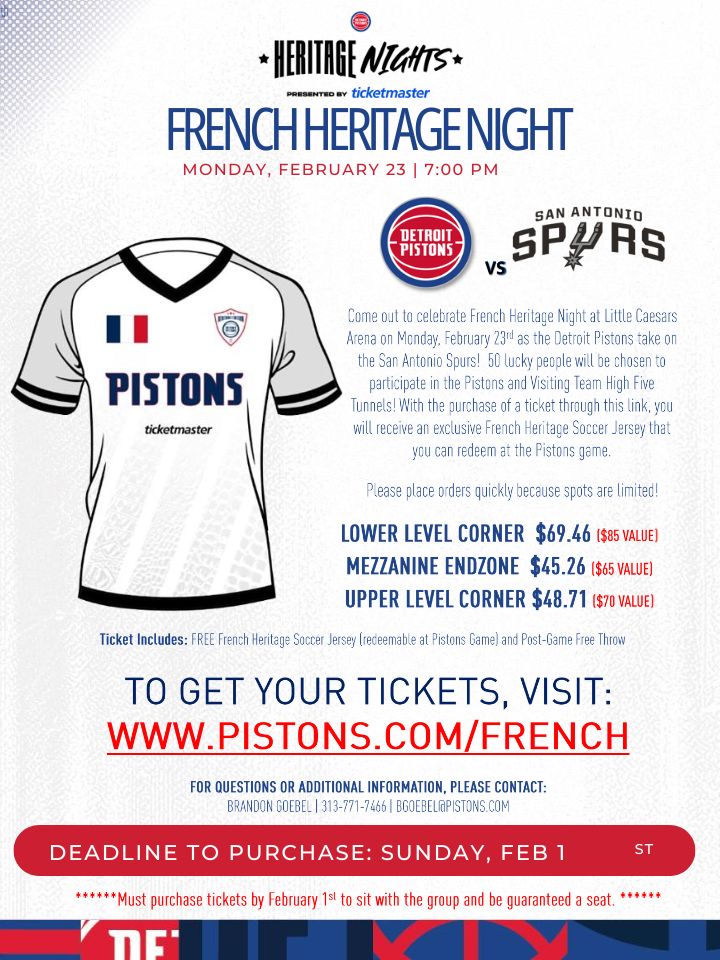 Come out to celebrate French Heritage Night at Little Caesars Arena on Monday, February 23rd as the Detroit Pistons take on the San Antonio Spurs at 7pm! Enjoy a special pre-game performance. With the purchase of a ticket you will receive a Special Edition French Heritage Pistons Soccer Jersey that you can redeem at the Pistons game and a free throw on the Pistons court.