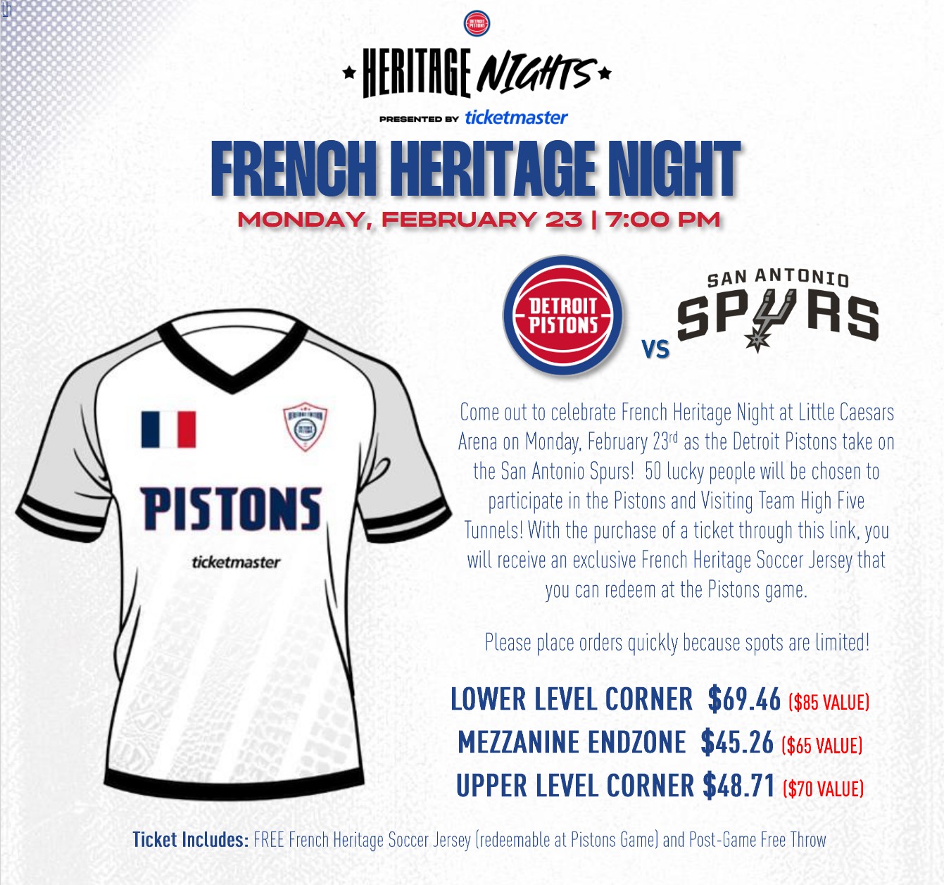 Come out to celebrate French Heritage Night at Little Caesars Arena on Monday, February 23rd as the Detroit Pistons take on the San Antonio Spurs at 7pm! Enjoy a special pre-game performance. With the purchase of a ticket you will receive a Special Edition French Heritage Pistons Soccer Jersey that you can redeem at the Pistons game and a free throw on the Pistons court.